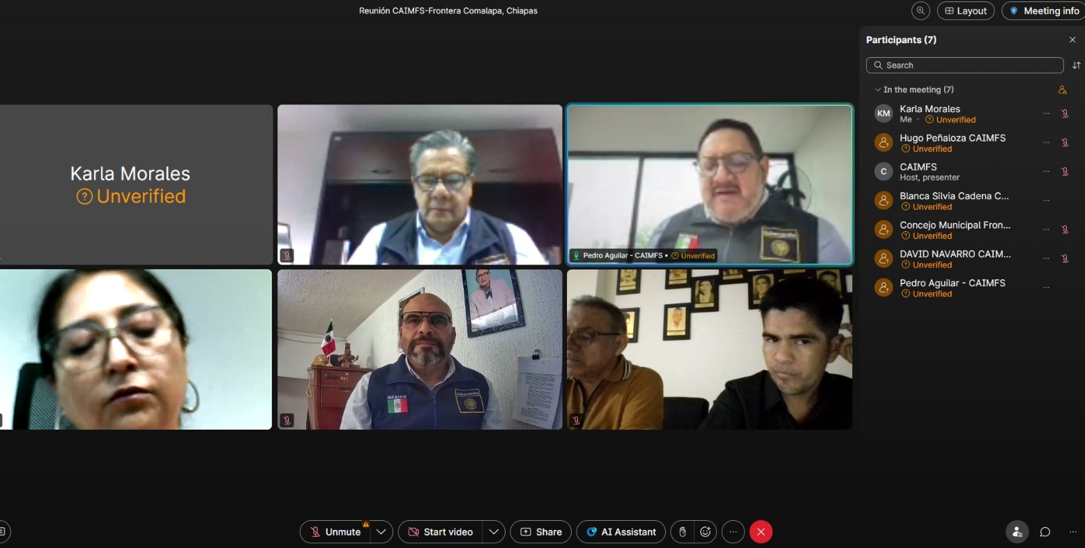 Servidores Púbicos de la Coordinación para la Atención Integral de la Migración en la Frontera Sur (CAIMFS), encabezados por el Director General, David Navarro Villa, realizaron una video reunión de trabajo con autoridades municipales de Frontera Comalapa, Chiapas, representadas por Víctor Alfredo Anzueto Robledo, Secretario Municipal y. Julio César Argueta Pasquett, encargado del área de Atención Ciudadana, en la que compartieron los avances de las acciones que se desarrollan de manera conjunta para la identidad jurídica de personas migrantes en esa localidad.